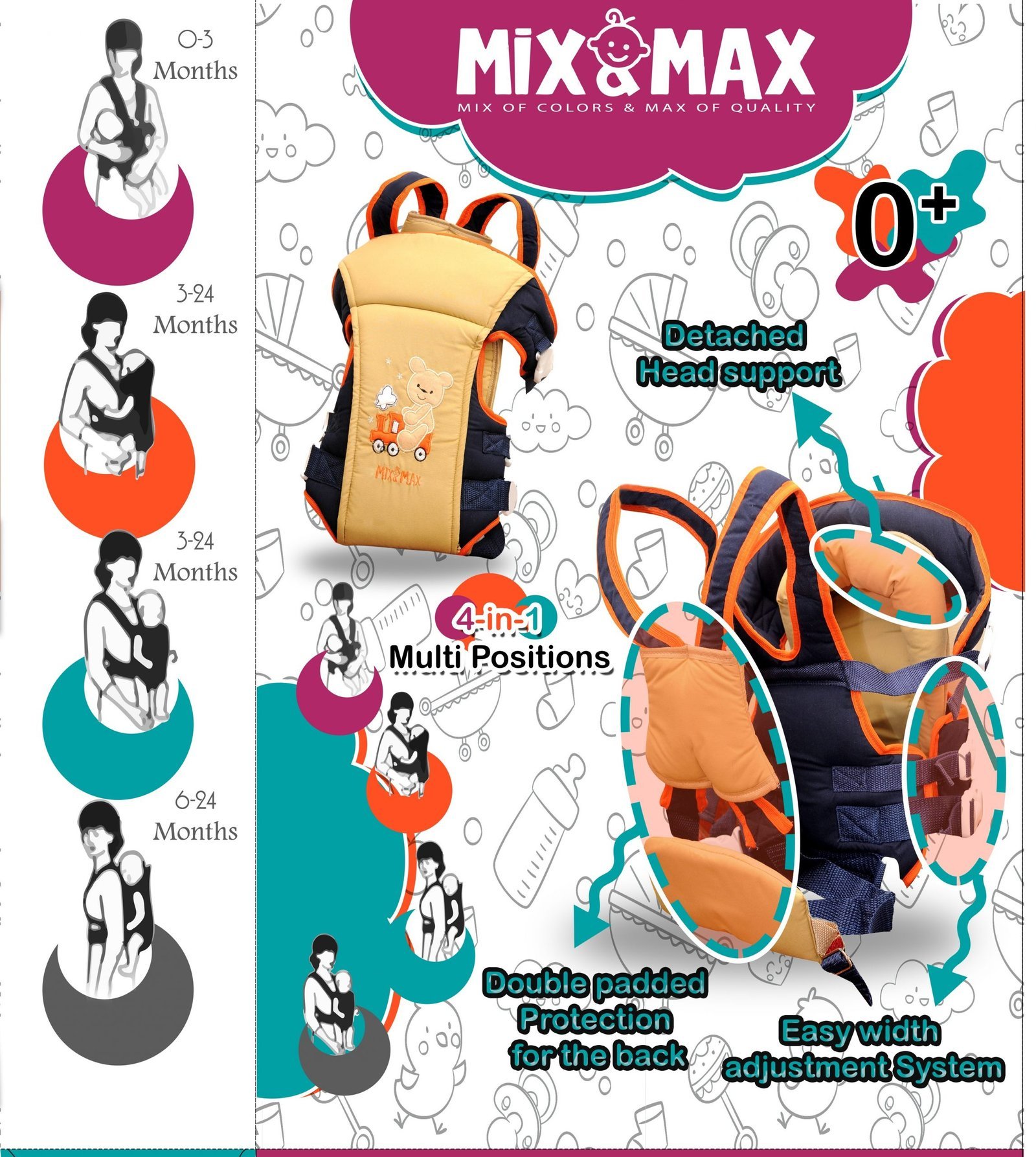 Baby Carrier 3 Positions with separate Head Support 4 in 1 Mix and Max – Suit Sizes: 0-24 Months (with Sleeping Position)