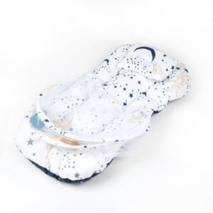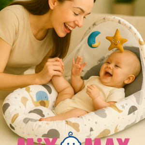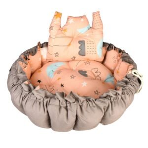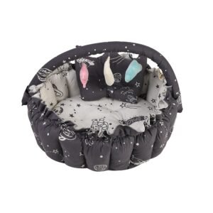 Baby Nest with Soft Toys and Mosquito Net – Comfortable Infant Sleeping Bed white grey color Mix and Max