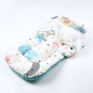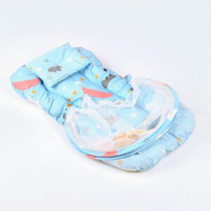 Baby Nest with Soft Toys and Mosquito Net – Comfortable Infant Sleeping Bed Light blue color Mix and Max